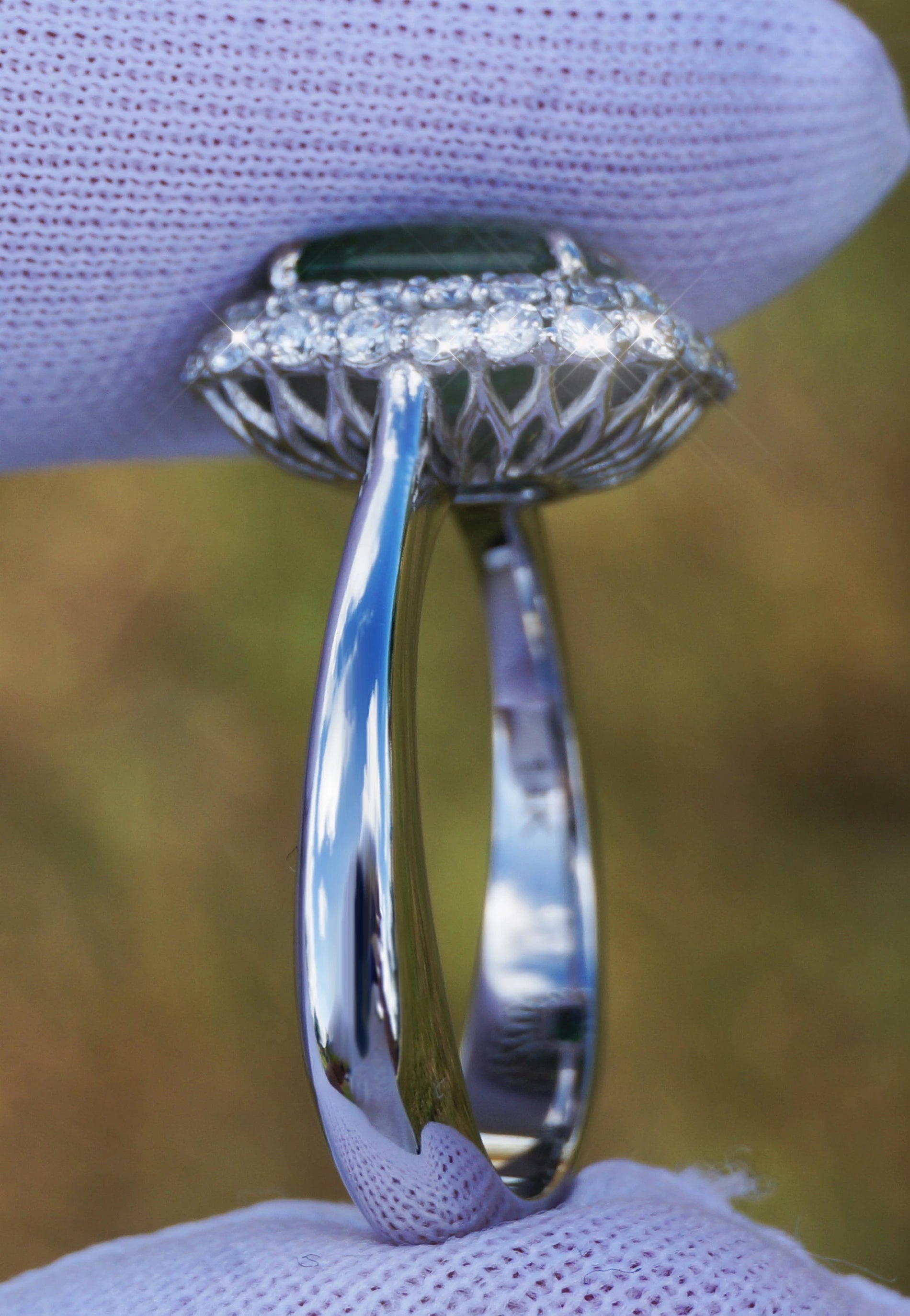 A Breathtakingly Striking HANDMADE 14k White Gold Ring with Beautiful Octagonal Cut Tsavorite in Green color! The GEM is 2.17CT and measures 8.26x6.17x4.56 mm! This Stone will take your breath away, especially on the sunlight! You will want to look at this stone endlessly. The mounting is a masterpiece! HANDMADE 14K White Gold Diamond Mounting (tested), that was is custom made to Accommodate this Beauty of a Gem in a V-prongs setting! Super FINE Workmanship on the Diamond v-split setting with 40pcs Brilliant Full Cut Diamonds in G color, SI1-SI2 clarity, totaling to approx 0.74ct! Fabulous Braided Band and Diamond Gallery! The Entire Top's outline is 14.0 x 12.0 mm- HUGE. The Ring weights 5.7 g, nice and SOLID. Sits 7.0 mm off the top of the finger. Finger size 7 (Free Re-sizing with purchase).