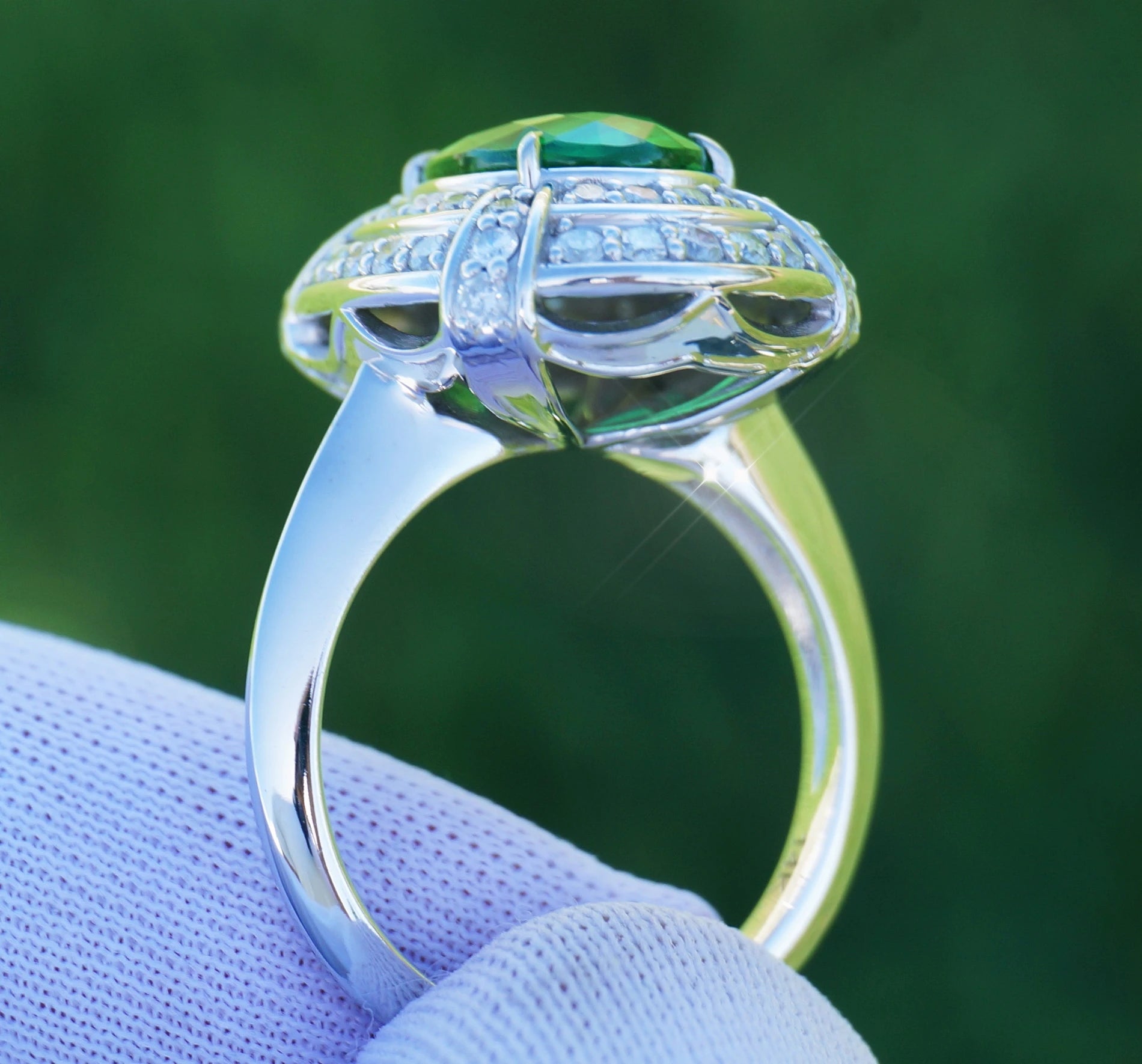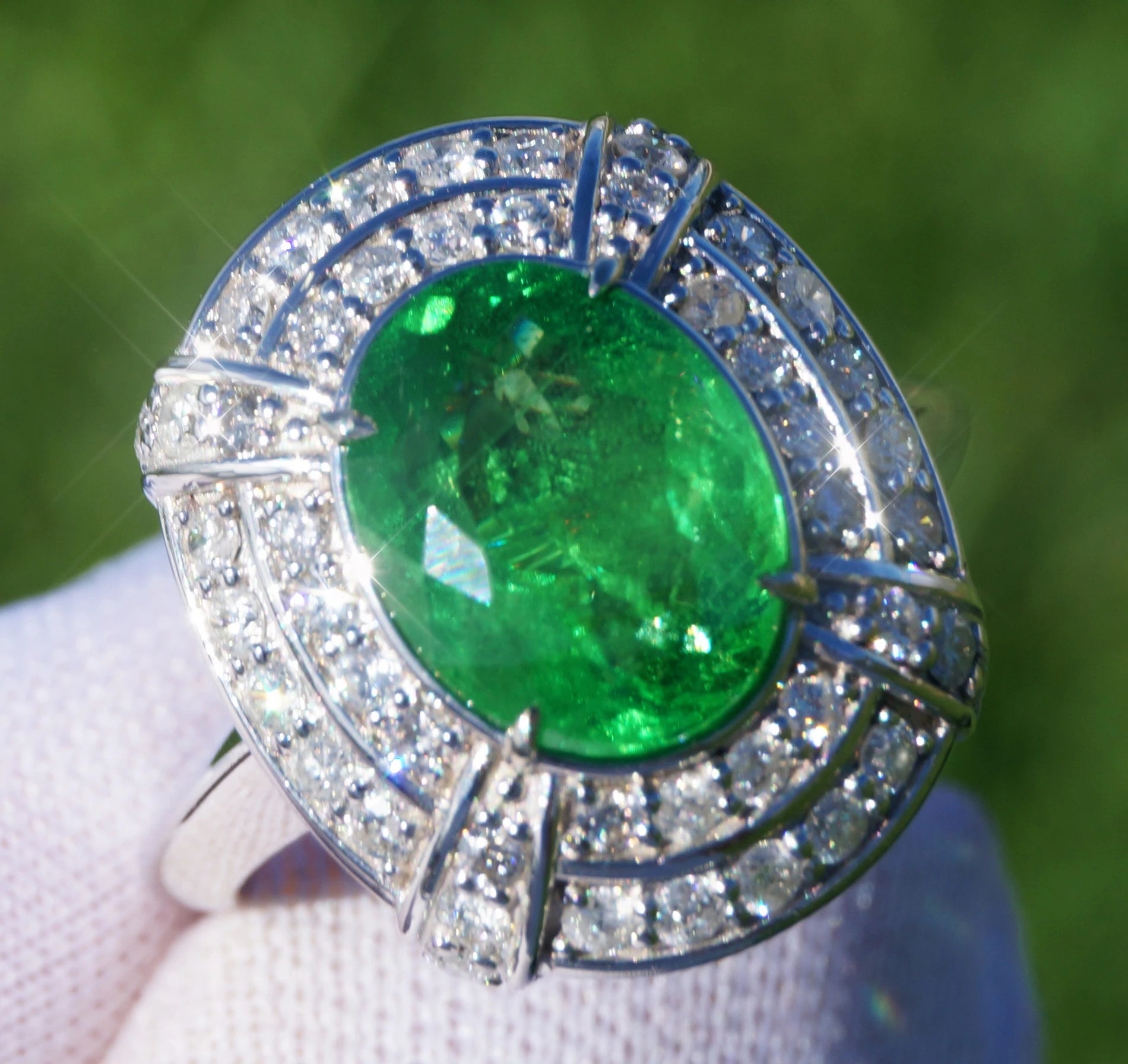 A Breathtakingly Striking HANDMADE 14k White Gold Ring with Beautiful Oval Cut Tsavorite in Green color! The GEM is 3.59CT and measures 10.59x8.20x4.93mm! This Stone will take your breath away, especially on the sunlight! You will want to look at this stone endlessly. The mounting is a masterpiece! HANDMADE 14K White Gold Diamond Mounting (tested), that was is custom made to Accommodate this Beauty of a Gem in a V-prongs setting! Super FINE Workmanship on the Diamond v-split setting with 48 pcs Brilliant Full Cut Diamonds in GH color, SI1 clarity, totaling to approx 0.71 ct! Fabulous Braided Band and Diamond Gallery! The Entire Top's outline is 18.5x15.5 mm- HUGE. The Ring weights 8.2 g, nice and SOLID. Sits 10.4 mm off the top of the finger. Finger size 7 (Free Re-sizing with purchase).