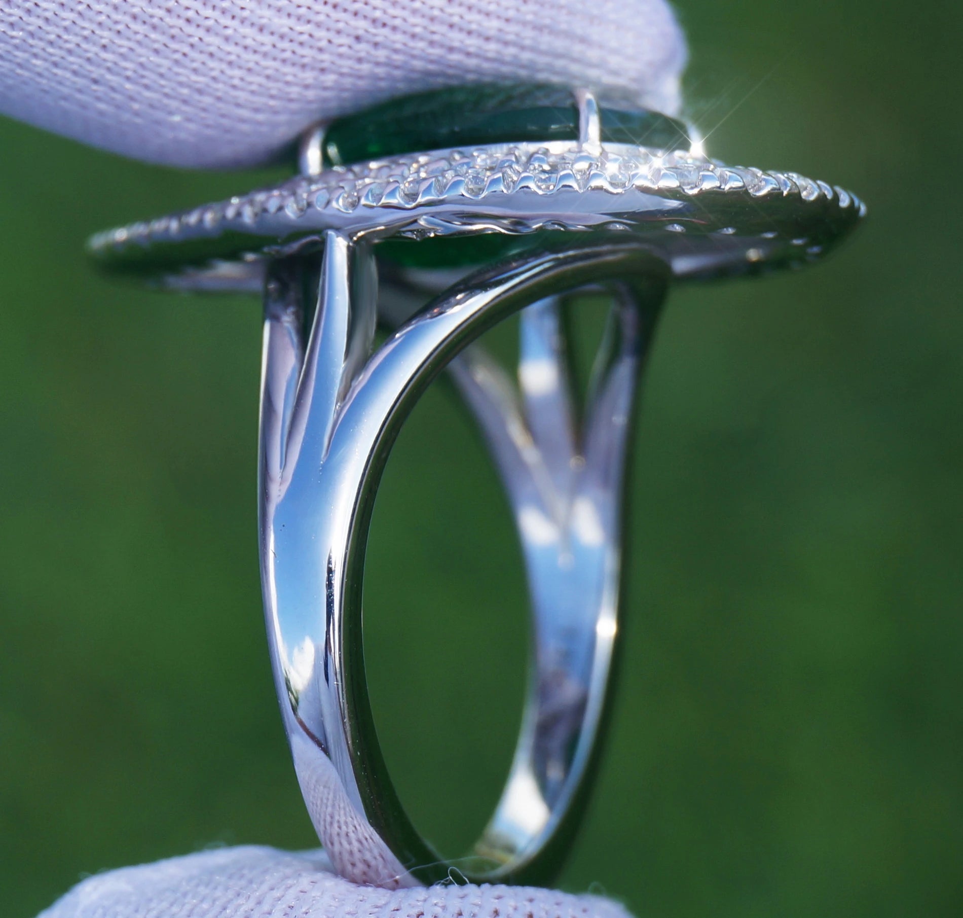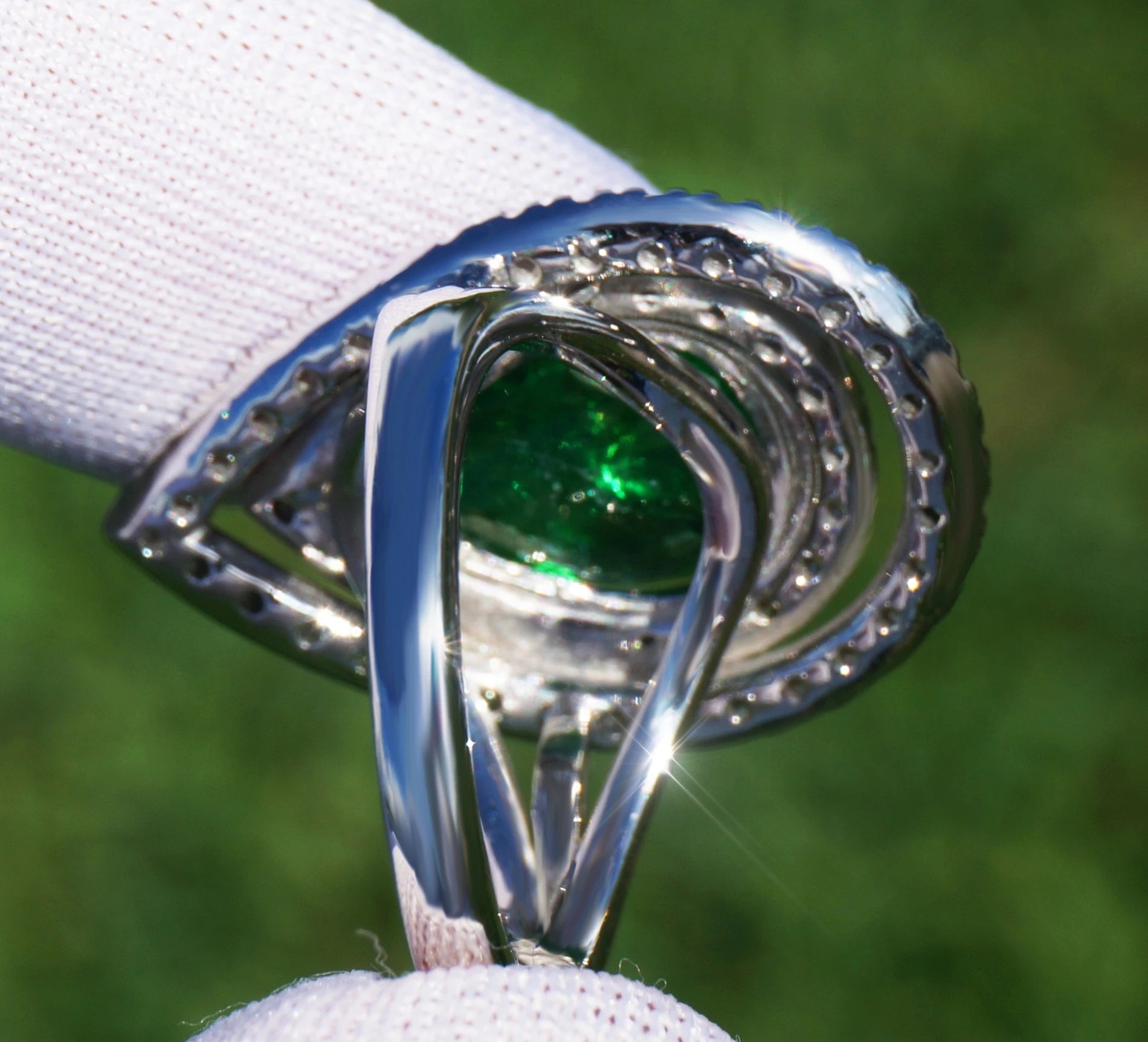 A Breathtakingly Striking HANDMADE 14k White Gold Ring with Beautiful Pear Cut Tsavorite in Green color! The GEM is 5.24 CT and measures 13.22x9.73x5.34 mm! This Stone will take your breath away, especially on the sunlight! You will want to look at this stone endlessly. The mounting is a masterpiece! HANDMADE 14K White Gold Mounting (tested), that was is custom made to Accommodate this Beauty of a Gem in Prongs setting! Super FINE Workmanship on the Diamond prong setting with 54 pcs Brilliant Full Cut Diamonds in GH color, SI1 clarity, totaling to approx 0.84 ct! Fabulous Braided Band and Diamond Gallery! The Entire Top's outline is 24.9x18.0 mm- HUGE. The Ring weights 8.5 g, nice and SOLID. Sits 6.7 mm off the top of the finger. Finger size 7 (Free Re-sizing with purchase).